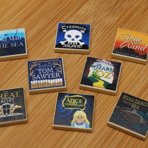The classic books pack includes 8 printed tiles on authentic new LEGO. They include the following: