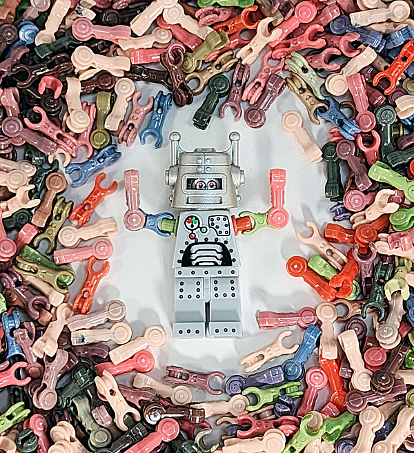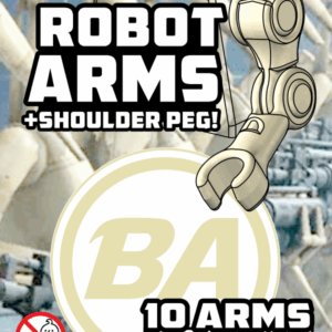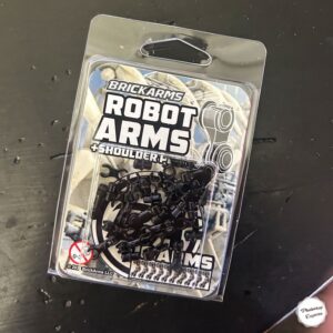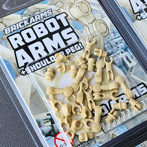 Robots, and mechanical minifigures will FLEX with jointed BrickArms Robot Arms! Just pop out the boring minifig arm, and pop in the BrickArms Robot Shoulder peg, and attach the BrickArms Robot Arm.